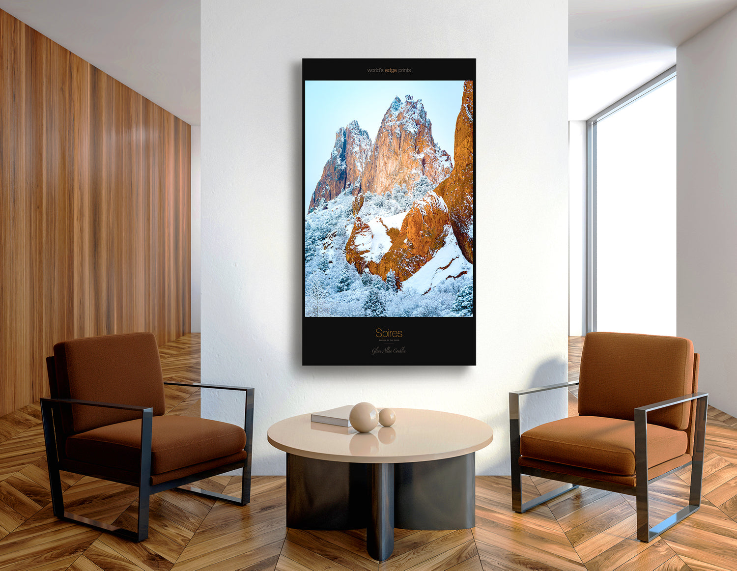 Interior picture (left) shows sample display of a metal/acrylic print (no frame required). Interior picture (right) shows sample display of a paper print with custom framing.